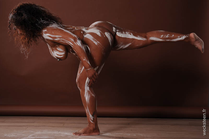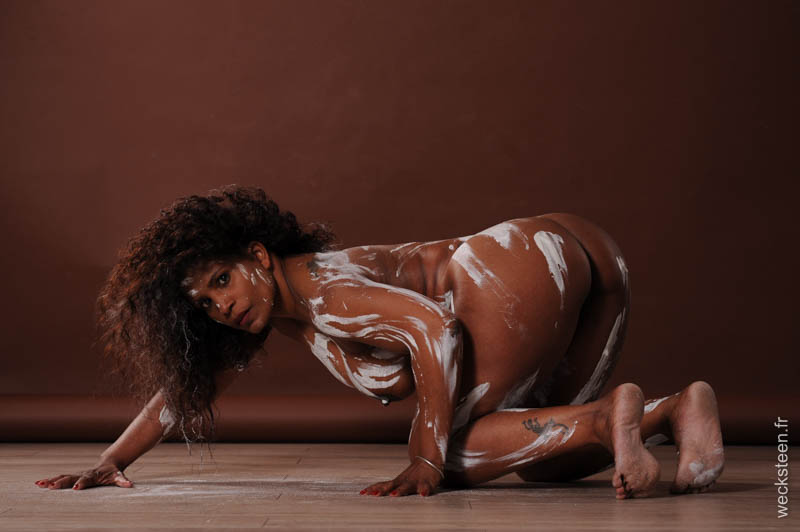 Pour cette deuxièmle partie de notre shooting, l'option retenue est le nu rien que le nu... Avec cependant quelques M&M's, un collier doré, de l'argile blanche et pour terminer la douche qui s'impose.