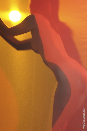 derrière un voile qui laisse transparaître les ombres et la silhouette